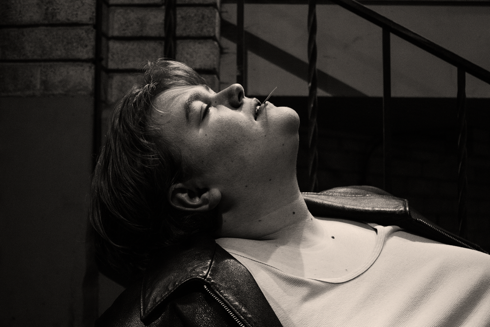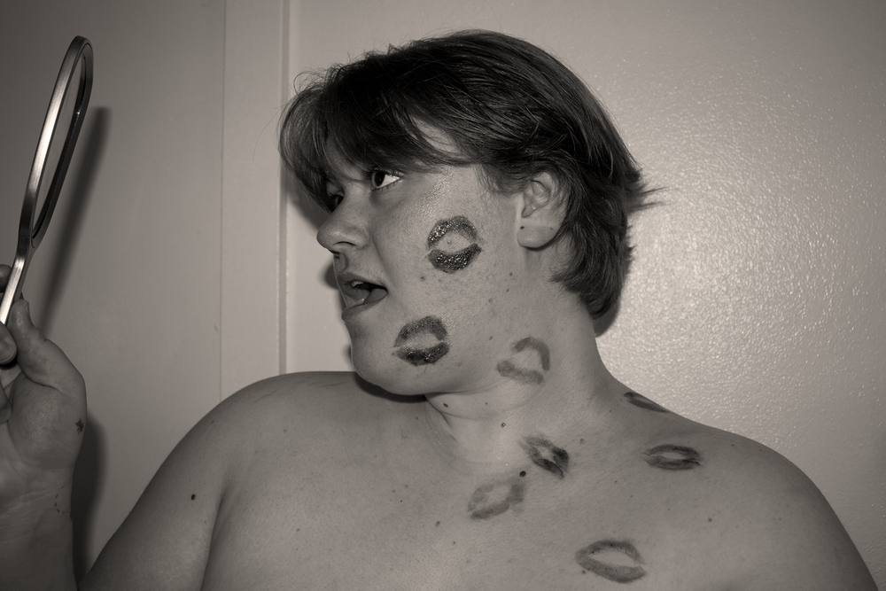 “my butch” includes both cinematic, B&W photos and dreamy, warm color in order to emphasize duality. I seek to convey the beauty and sanctity of butch-femme dynamics and the ways they blur and negotiate masculinity, femininity, and transness. Through framing my butch partner with my femme perspective, a sense of intimacy and vulnerability is created with strength, softness, sensuality, and warmth.