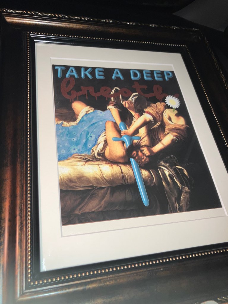 “Take A Deep Breath” explores the catharsis of vengeful grief in the lifelong aftermath of sexual abuse. In the 1600s, Artemisia Gentilseschi completed one of her most iconic and, during her time, controversial masterpieces, Judith Slaying Holofernes. In contrast to other depictions of the biblical story, Gentilisechi depicted both Judith and her servant, Abra, as active and decisive attackers upon Holofernes. The artist Gentilsechi created the painting after being raped by a close friend of her fathers. Even more tragically, Gentisechi’s female chaperone colluded with the rapist’s plans. A popular interpretation of this work says it served as a way for Gentisechi to process her own grief through the biblical story of Judith; Her grief for both the lack of protection afforded to her and the injustice she experienced.